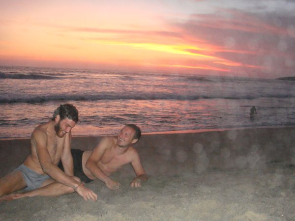 | Me and Yair looking 'pretty friendly' on the beach at Puerto Escondido. We had raced each other there hitching in trucks and cars and he won by travelling through the night while I stopped off and slept in a half-built house. By the time I got there he'd already found us an awesome hotel room: two pound fifty a night with a pool right by the beach! This picture was actually taken by a girl he was sleeping with, so you can get that idea out of your head. |